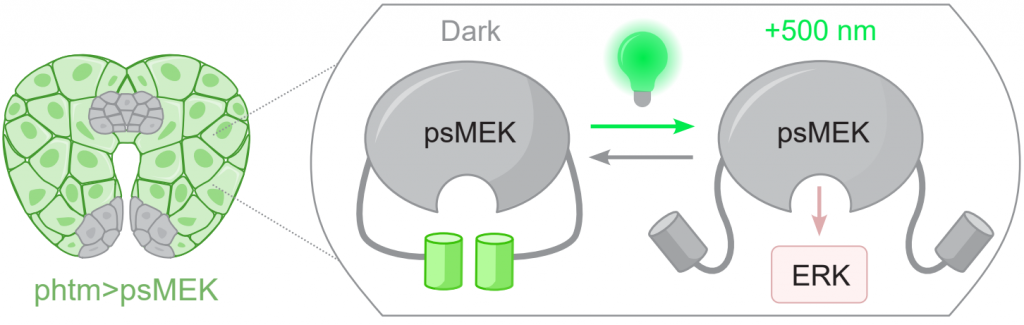 System identification approaches are commonly used in engineering to infer simple yet predictive models of complex systems from their responses to time-dependent perturbations. Here, we apply this strategy at the whole organism scale, establishing a predictive model of commitment to metamorphosis in Drosophila. At this critical point in animal development, the larva stops feeding and proceeds to take on the adult form. The neuroendocrine circuits governing commitment to metamorphosis assess the growth and patterning programs, eventually triggering the production of systemic hormones that terminate growth and initiate metamorphosis. Previous studies of these circuits relied on relatively static genetic perturbations and starvation experiments. Here, we take advantage of optogenetic approaches in Drosophila to flexibly perturb a key signaling node within the endocrine gland in otherwise undisturbed larvae. We used this approach to infer parameters in a compact mathematical model and demonstrate that it makes accurate predictions of larval commitment to metamorphosis. Our work paves the way for quantitative studies of other juvenile-to-adult transitions, including mammalian puberty, which relies on strikingly similar mechanisms.